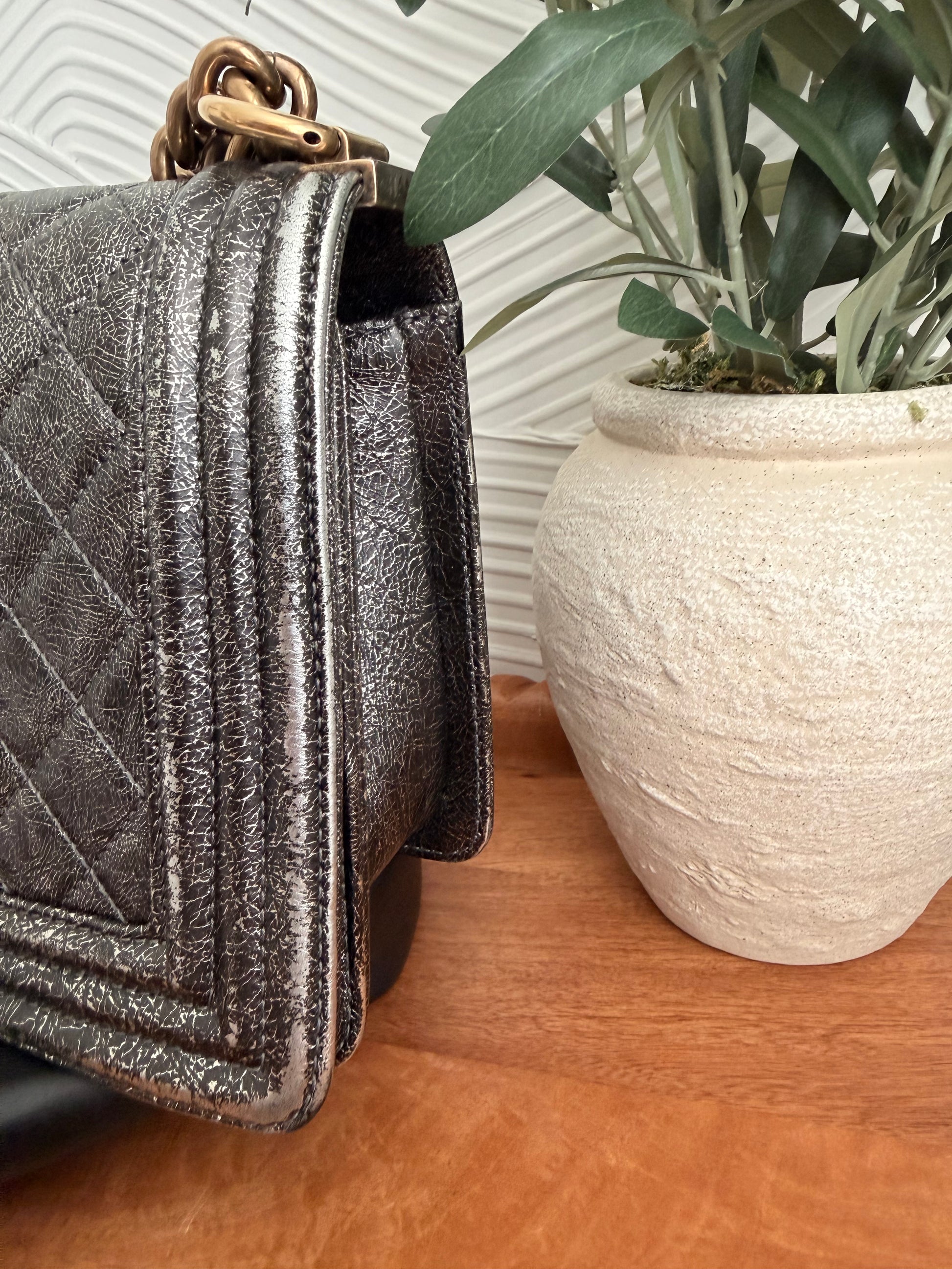 Bolso Chanel Boy de piel de becerro metalizada agrietada y acolchada